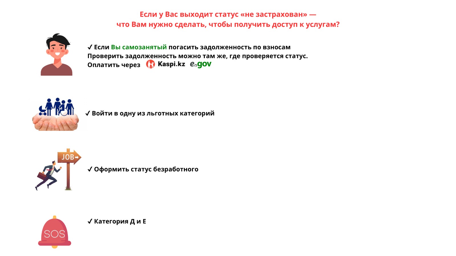 Ағымдағы жылы «Қазақстан Республикасының кейбір заңнамалық актілеріне міндетті әлеуметтік медициналық сақтандыру және медициналық қызметтер көрсету мәселелері бойынша өзгерістер мен толықтырулар енгізу туралы» Заңды іске асыру шеңберінде 2025 жылғы 1 қаңтардан бастап күшіне енетін бірқатар нормативтік-құқықтық актілер әзірленді. Анықтама: «Амбулаториялық жағдайлардағы мамандандырылған медициналық көмек көрсету қағидаларын бекіту туралы» ҚР Денсаулық сақтау Министрінің 2022 жылғы 27 сәуірдегі № ҚР ДСМ-37; «Созылмалы аурулары бар адамдарға медициналық көмек көрсетуді ұйымдастыру, байқаудың мерзімділігі мен мерзімдерін, диагностикалық зерттеулердің міндетті минимумы мен еселігі қағидаларын бекіту туралы» 2020 жылғы 23 қазандағы №ҚР ДСМ-149/2020, «Қазақстан Республикасында медициналық санитариялық алғашқы көмек көрсетуді ұйымдастыру стандартын бекіту туралы» 2023 жылғы 30 наурыздағы № 49, «Әлеуметтік мәні бар аурулардың тізбесін бекіту туралы» 2020 жылғы 23 қыркүйектегі № ҚР ДСМ-108/2020 бұйрықтар.